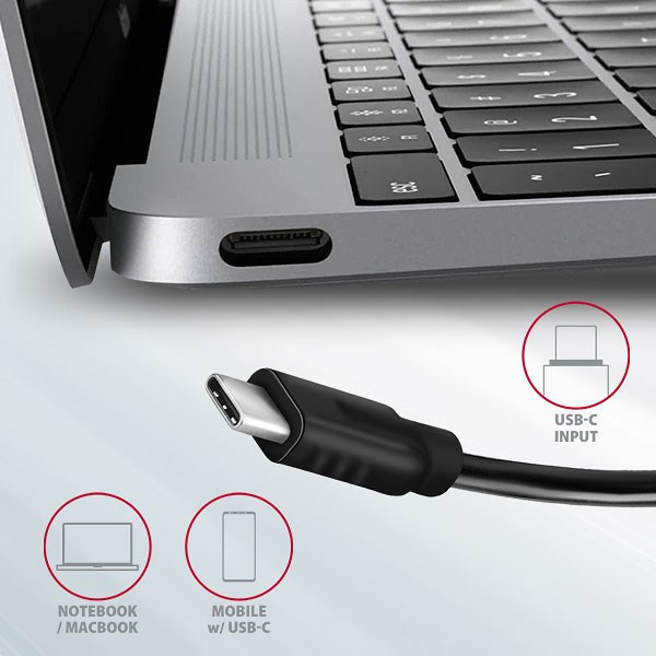 - Výkonné nabíjanie mobilných zariadení prúdom až do 3A pri 5V v portoch USB-C rozbočovača.