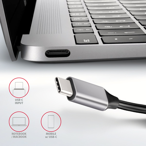 Výstup HDMI poskytuje vysokokvalitný obraz až do rozlíšenia 4K/30Hz Ultra HD a podporuje viackanálový prenos zvuku. Podporované sú aj populárne rozlíšenia prehrávača WQHD 2560 x 1440 pri 60 Hz alebo FullHD 1920 x 1080 pri 60, 100 a 120 Hz max. Aby video výstup fungoval správne, port USB-C prenosného počítača musí podporovať alternatívny režim DisplayPort (DP Alt Mode) alebo Thunderbolt 3.