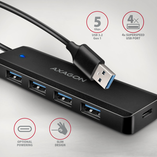 AXAGON HUE-C1A, 4x USB 5Gbps TRAVEL hub, USB-C napájací konektor, kábel USB-A 19cm