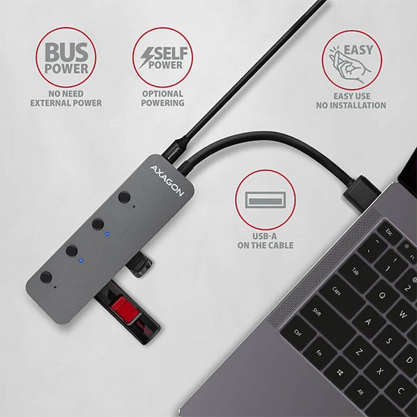 Kovový USB 3.2 Gen 1 (USB 3.0) Rozbočovač AXAGON HUE-MSA nielenže pripojí k notebooku alebo počítaču až štyri zariadenia USB súčasne, ale ponúka aj funkciu vypnutia portu USB a funkciu nabíjacieho rozbočovača. Kovové telo rozbočovača je vyrobené z hliníka a poskytuje dokonalú mechanickú ochranu pri častom prenášaní. Elegantný, jemne štruktúrovaný povrch zabraňuje nechceným odtlačkom prstov. Gumové nožičky zabraňujú kĺzaniu hubky po stole. 20 cm dlhý pevný kábel USB je ideálny pre používateľov mobilných zariadení.