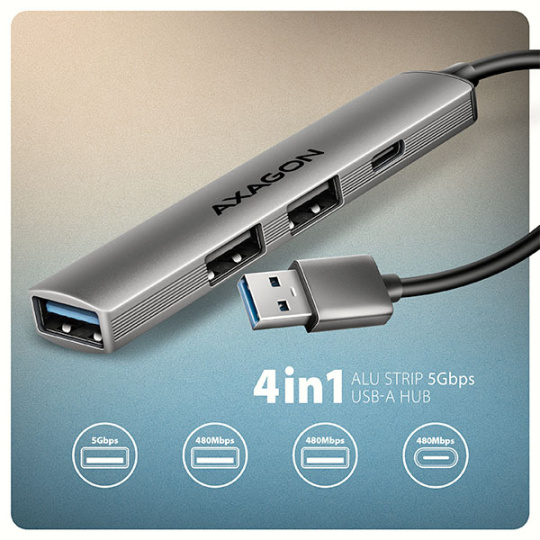 AXAGON HUE-STA, 4x USB ALU STRIP hub, 1x USB-A 5Gbps, 2x USB-A & 1x USB-C 480Mbps, kábel USB-A 12cm