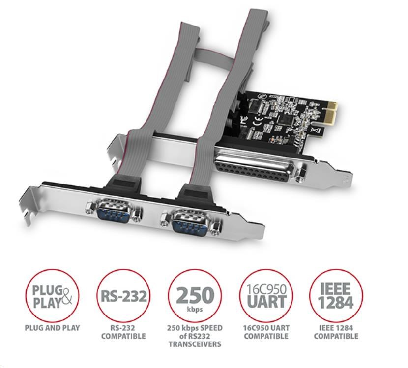 Karta AXAGON PCEA-PSN PCI-Express rozširuje váš stolný počítač o jeden paralelný port s konektorom DB25 na doske a dva sériové porty RS-232 s konektormi DB-9 na záslepke.