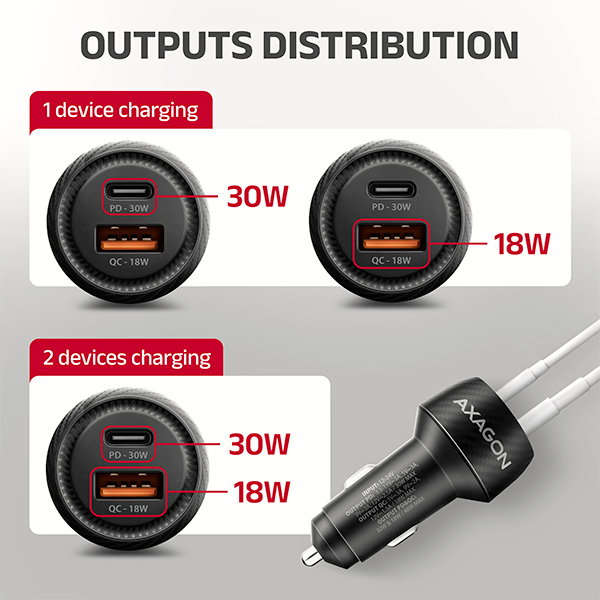 Univerzální nabíječka do auta AXAGON PWC-PQ48 umožňuje rychlé nabíjení až dvou mobilních zařízení současně pohodlně na cestách. Díky celkovému výkonu 48W dokáže nabíječka dobíjet telefon a tablety nejvyšší možnou rychlostí. Adaptér nabízí nejen standardní USB-A konektor, ale také oboustranný USB-C konektor.
