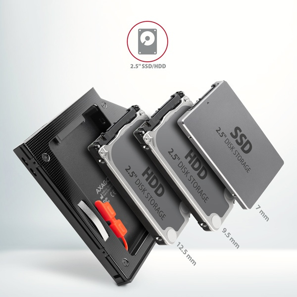Rám AXAGON RSS-CD12 pre 2.5" SSD/HDD na DVD, 12.7 mm, LED, hliník