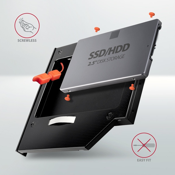 Jedinečný bezskrutkový systém upevnenia diskov sa upevňuje pomocou gumových svoriek alebo gumových závitových vložiek. Gumové vložky tiež pomáhajú minimalizovať vibrácie pevného disku. Kovové pružiny pomáhajú upevniť adaptér v hriadeli optického pohonu. Kovové telo rámu je vyrobené z hliníka a poskytuje dokonalú mechanickú ochranu vloženému disku. Zabudovaný kondenzátor HQ pomáha stabilizovať napájanie SSD/HDD. Vloženie disku a prenos dát signalizuje elegantná zabudovaná LED dióda. Súčasťou balenia je aj plastová predná časť (záslepka), ktorá imituje prednú časť optickej mechaniky CD/DVD. Na zadnej strane redukcie je niekoľko montážnych otvorov na upevnenie rámu v tele notebooku.