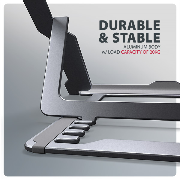 Podstavec je vyroben z hliníkových odlitků garantujících dlouhou životnost a spolehlivost. Díky protiskluzové úpravě se nemusíte obávat nežádoucích pohybů – vaše zařízení zůstane pevně na svém místě, a to bez poškození povrchu notebooku či podložky. Tyto pečlivě navržené vlastnosti zaručují perfektní stabilitu pro váš notebook, tablet nebo dokonce oblíbenou knihu, což vám poskytne klid a pohodlí při každodenním používání.