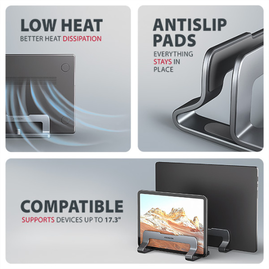 AXAGON STND-VG, vertikálny hliníkový stojan pre notebooky 10"-17.3, nastaviteľný rozostup, sivý