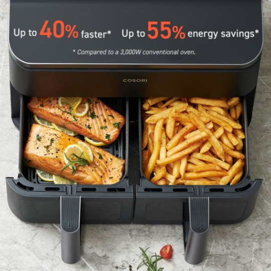 Kapacita každého samostatného koša teplovzdušnej fritézy Cosori Dual Basket je 4,25l, jej celková kombinovaná kapacita je teda až 8,5l. Vďaka tomuto obrovskému objemu môžete bez obáv pripravovať 2 rôzne chody pre celú rodinu, alebo dvojnásobné množstvo jedného chodu pre rodinu a priateľov.