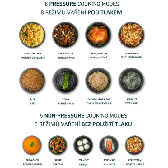- Tlakové varenie, ryža, para, ovsené vločky/kaša, dusené mäso/vývar, fazule/zrno, mäso/drutí, jogurt, koláč, pomalé varenie, soté, Sous Vide, udržovanie teploty