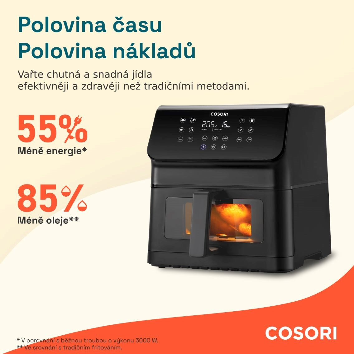 Predstavujeme teplovzdušnú fritézu Cosori Premium II vo verzii Plus. Inovatívne riešenie, ktoré šetrí nielen čas, ale aj energiu a ponúka spôsob varenia, ktorý je šetrný k zdraviu. S teplovzdušnou fritézou si môžete vychutnať svoje obľúbené jedlá pripravené s minimom oleja, vyhnete sa zápachu z vyprážania a čistenie je vďaka košu, ktorý možno umývať v umývačke riadu, hračkou. Fritéza ponúka kôš s veľkorysým objemom 6,2 litra, takže v nej pohodlne pripravíte jedlo pre 3 až 5 osôb, napríklad celé kurča s hmotnosťou 2,3 kg. Verzie Plus je vybavená okienkom a svetlom, takže vidíte, v akej fáze prípravy sa práve nachádzate, bez toho aby ste museli vysúvať kôš a prerušovať prípravu. Pri veľkom objeme si fritéza zachováva malé vonkajšie rozmery, takže je vhodná aj do malých kuchýň. Vďaka technológii 360° cirkulácie vzduchu sa fritéza zohreje na prevádzkovú teplotu za menej ako 5 minút, čo ďalej výrazne skracuje čas prípravy. Malý objem znamená aj nízku spotrebu energie v porovnaní s bežnou rúrou. Fritéza ponúka 12 programov na prípravu pokrmov, ktoré možno nastaviť podľa individuálnych chutí. Displej fritézy je prehľadný a pohodlne naklonený pre dokonalú čitateľnosť. V dnešnej digitálnej dobe je atraktívna aj funkcia stlmenia tlačidiel. Ako bonus k dodávanej viacjazyčnej kuchárskej knihe si môžete stiahnuť elektronickú kuchársku knihu s 80 receptami v českom aj slovenskom jazyku. V balení nájdete aj 5 ihiel na špíz a mriežku na špíz.