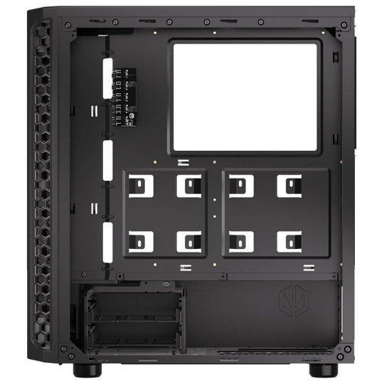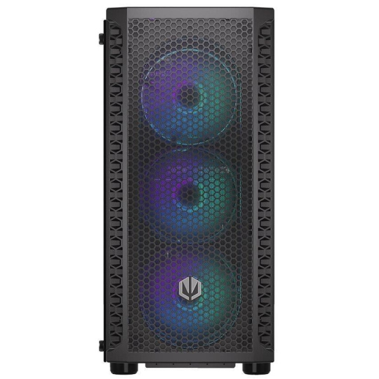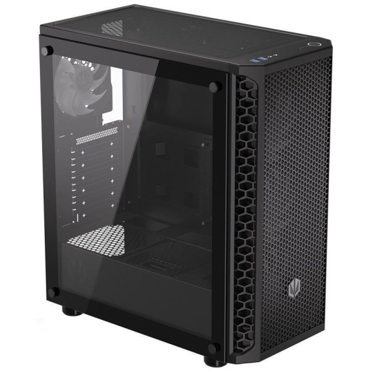 Skriňa formátu Middle Tower s priehľadnou bočnicou z tvrdeného skla ponúka dve 2,5" pozície pre SSD disky a dve 3,5" pozície pre pevné disky. Na hornej časti sa nachádza dva USB 3.0 porty, sluchátkový výstup a audio vstup pre mikrofón. Vybavená je štyrmi 120 mm ventilátormi s ARGB podsvietením, ktoré spolu s perforovaným čelným panelom zabezpečujú dostatočné prúdenie vzduchu. Dômyselné riešenie umožňuje pohodlné umiestnenie až 360 mm dlhého výmenníka vodného chladenia na prednej strane. V skrini je dostatok priestoru pre chladič CPU do výšky až 161 mm a grafickú kartu dlhú až 350 mm. Dodávaná je bez zdroja. Súčasťou je aj sada prachových filtrov.