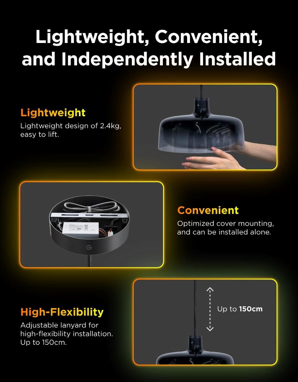 Závesné svietidlo Govee je vybavené trojzónovým kruhovým osvetlením, ktoré poskytuje 360° osvetlenie s možnosťou nezávislého ovládania každej zóny. Svetlo je nastaviteľné od teplej bielej 2700 K po studenú 6500 K a ponúka vysoký index podania farieb (CRI 95). Inštalácia lustra je jednoduchá a vďaka nastaviteľnému závesnému káblu až do dĺžky 150 cm ho môžete ľahko prispôsobiť výške vášho stropu.