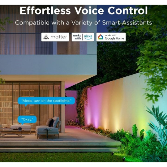 Energeticky úsporné záhradné reflektory so svetelným výkonom 750 lm urobia z vašej záhrady dizajnový skvost. Vďaka technológii RGBICWW dokážu zobraziť až 16 miliónov farieb a ponúkajú aj biele spektrum od 2700 do 6500 K. Na výber máte určite viac ako 50 režimov osvetlenia a pri počúvaní obľúbenej hudby si môžete vybrať aj zo 6 režimov rytmu. Alebo si jednoducho nastavte vlastné farebné kombinácie podľa svojich predstáv na každom z nich. Príkazy môžete zadávať aj hlasom prostredníctvom Siri, Amazon Alexa alebo Google Assistant, prípadne prostredníctvom aplikácie Govee Home v smartfóne alebo tablete. Nové svetlá podporujú technológiu Matter, takže natívne podporujú aj Apple Homekit. Svetlo má celkovú dĺžku takmer 16 metrov a veľmi ľahko sa inštaluje. Pomocou časovača môžete svetlá automaticky zapínať a vypínať na základe západu a východu slnka. Svetlá majú stupeň vodotesnosti IP67 (okrem napájacieho adaptéra) s prevádzkovou teplotou od -20 °C do 40 °C.