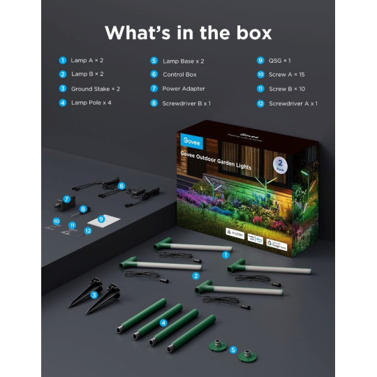 Vonkajšie osvetlenie Govee podporuje najmodernejší štandard Matter, ktorý umožňuje jednoduchú a bezproblémovú integráciu do inteligentnej domácnosti. Vďaka tejto technológii môžete svetlá ovládať hlasovými príkazmi prostredníctvom populárnych asistentov, ako sú Amazon Alexa alebo Google Home. Stačí jedno slovo a svetlá sa rozsvietia, zmenia farbu alebo zapnú vašu obľúbenú scénu. Pohodlné a intuitívne ovládanie tak prináša maximálne pohodlie a slobodu pre vaše vonkajšie osvetlenie.