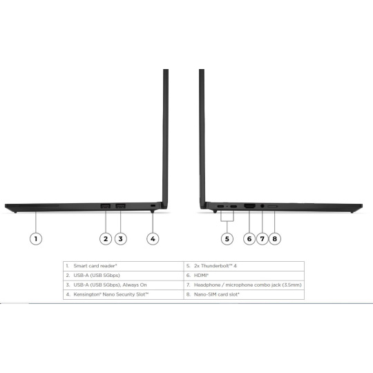 | Standartné porty | 1x USB-A (USB 5Gbps / USB 3.2 Gen 1) 1x USB-A (USB 5Gbps / USB 3.2 Gen 1), Always On 2x USB-C® (Thunderbolt™ 4 / USB4® 40Gbps), with USB PD 3.0 and DisplayPort™ 2.1 1x HDMI® 2.1, up to 4K/60Hz 1x Headphone / microphone combo jack (3.5mm) |