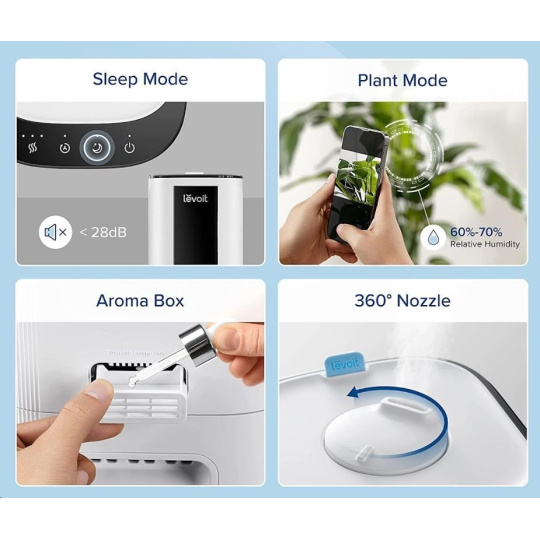 Prevádzka je veľmi tichá a nebude vás rušiť ani pri spaní. Budete môcť nerušene snívať a zvlhčovač Levoit OasisMist Smart sa postará o kvalitu a vlhkosť vzduchu v miestnosti podľa vašich predstáv. Hlučnosť v prevádzke je iba 28 dB.