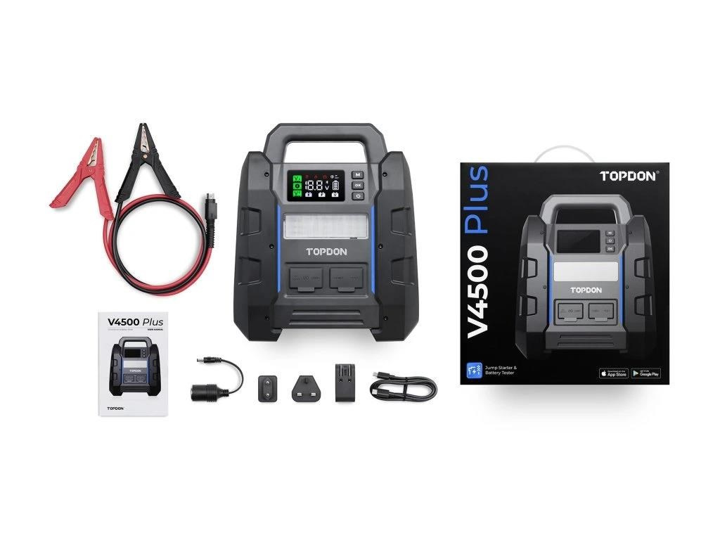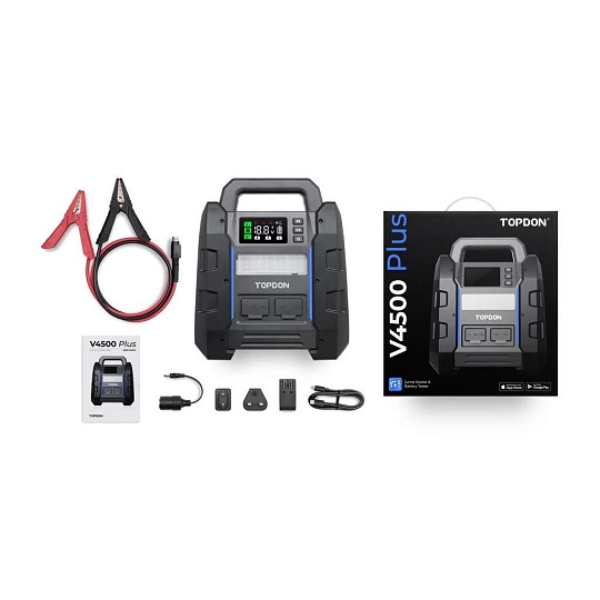 Jump startér TOPDON V4500 Plus ponúka dokonalé riešenie napájania pre vozidlá s veľkým objemom, ako sú návesy a prívesy. So špičkovým prúdom 4500 A je špeciálne navrhnutý pre automobily s napätím 12 V a je vhodný pre benzínové a naftové vozidlá s objemom motora až do 16 litrov.
