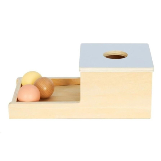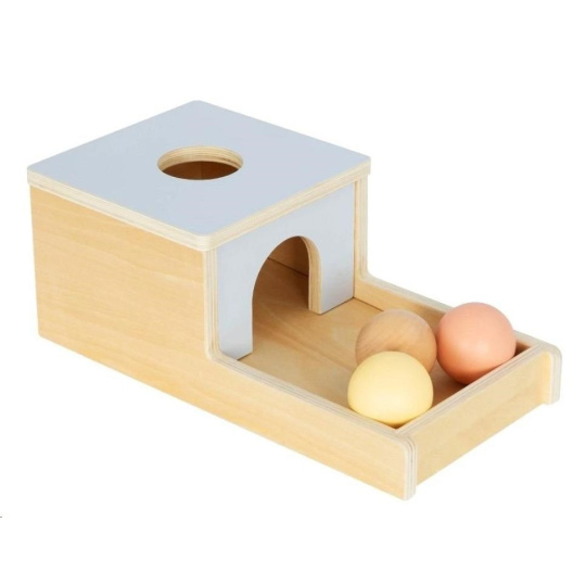 Drevený box (bednička) s drevenými guľami v prírodných pastelových farbách zoznámi bábätko s vlastnosťami objektov (predmetov), v tomto prípade drevených gúľ. 3 drevené gule v prírodnom prevedení a v jemných pastelových farbách miznú v drevenom domčeku (boxe), aby sa potom dvierkami vykotúľali do drevenej záhradky (ohrádky). Túto záhadu musí každé dieťa vyriešiť a tak bude túto zábavnú činnosť opakovať znova a znova. Pri opakovanej hre deti zdokonaľujú svoje zručnosti, zabavia sa a užijú si veľa zábavy.