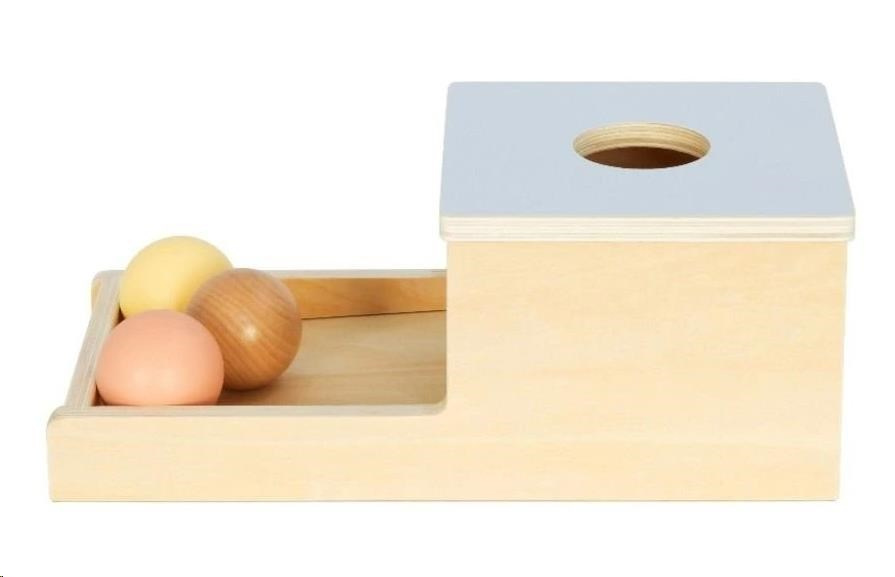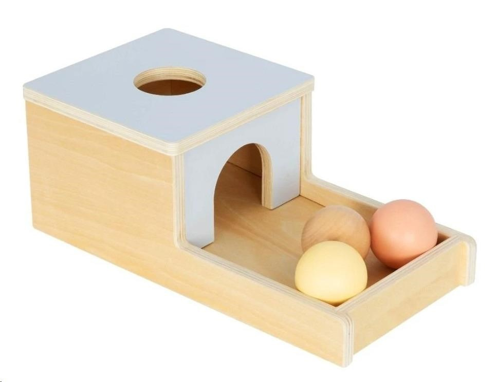 Drevený box (bednička) s drevenými guľami v prírodných pastelových farbách zoznámi bábätko s vlastnosťami objektov (predmetov), v tomto prípade drevených gúľ. 3 drevené gule v prírodnom prevedení a v jemných pastelových farbách miznú v drevenom domčeku (boxe), aby sa potom dvierkami vykotúľali do drevenej záhradky (ohrádky). Túto záhadu musí každé dieťa vyriešiť a tak bude túto zábavnú činnosť opakovať znova a znova. Pri opakovanej hre deti zdokonaľujú svoje zručnosti, zabavia sa a užijú si veľa zábavy.