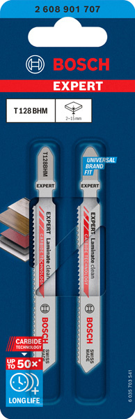Vydrží až 50× dlhšie v odolných materiáloch než pilový plátok Bosch T101B - Pri montáži laminátových podláh alebo obkladov HPL musia byť rezy priamou pílou čisté. Materiál je však tak abrazívny, že sa bežné plátky rýchlo otupia a prestaňo fungovať. Pilový plátok EXPERT Laminate Clean T128BHM kombinuje čisté rezanie protismerne orientovaných zubov s technológiou Carbide Technology, aby sa zachoval skvelý výkon počas veľmi dlhé životnosti. Jeho karbidové ozubenie zabezpečuje opakované, vysoko kvalitné rezy do abrazívnych materiálov, ako sú vláknami vyztužené vinylové podlahy a panely z vysokotlakého lamina. Veľmi jemné zuby režu v tenkom materiáli hladko a protismerný dizajn zabezpečuje veľkú čistotu rezu na oboch stranách. Bosch EXPERT Laminate Clean T128BHM je vysoko výkonným pilovým plátkom pre priamové pily pre prácu s laminátom. Vzhľadom k veľmi dlhé životnosti je tiež jasnou voľbou pre remeselníkov, ktorých už nebaví plytvať peniazmi za pilové plátky, ktoré nevydržia. Kompatibilný so všetkými pílami s upínaním do T