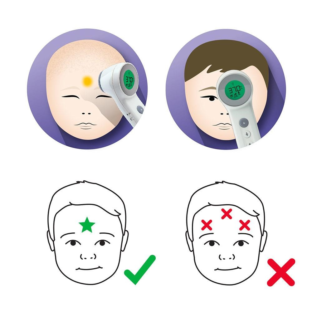 Bezdotykový + dotykový teplomer s presnosťou Age Precision. Patentovaný teplomer využíva technológiu pre jednoduché, bezdotykové a neuveriteľne presné meranie teploty. Chcete-li vykonať meranie v dotykovom režime, umiestnite teplomer medzi obočie na čelo. V bezdotykovom režime držte teplomer medzi obočím približne 2 cm pred čelom dieťaťa. Meranie je teda bez stresu a možno ho vykonať bez rizika, že dieťa vzbudíte. Okrem toho je možné použiť tichý režim, takže môžete merať teplotu dieťaťa takmer nepočuteľne. Okrem toho môžete pomocou režimu Jedlo a tekutiny ľahko merať teplotu jedla, nápojov alebo vody vo vani vášho dieťaťa. Poznámka: Používateľ by mal medzi opakovanými meraniami u tej istej osoby počítať s primeraným časovým odstupom. Na čistenie vždy utrite navlhčenou handričkou a potom utierkou osušte. Nikdy nepoužívajte antibakteriálne čistiace prostriedky a utierky, pretože môžu prístroj nenávratne poškodiť.