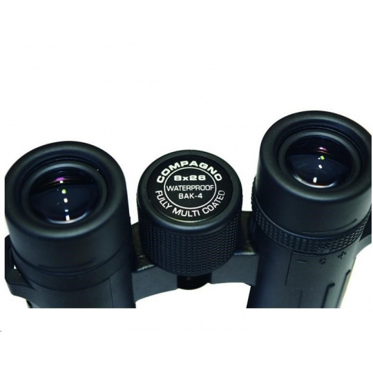 Kompaktný ďalekohľad COMPAGNO 10x26, zväčšenie 10x, predná šošovka 26mm, zorné pole 98m, ostré od 4m, optický výstup 2,6mm, vzdialenosť stredu očí 56-74mm s odstupom 14,1mm, svetelnosť 6,8, stmievanie 16,1, rozmery 117x115x40 mm, hmotnosť 325g, čierny. Kompaktné ďalekohľady DCF s strešovými hranolmi BaK4 - ROOF (DACH). Modelová rada s moderným dizajnom, malými rozmermi, nízkou hmotnosťou a vysokou optickou kvalitou pre kontrastný pohľad aj za zhoršených svetelných podmienok. Výkonný a odolný ďalekohľad s Fully Multicoated úpravou, hranoly z BaK4 skla, vodotesný do 0,5m/15 minút s ochranou proti zahmlievaniu plnením dusíkom, vhodný aj na sledovanie s okulármi, nastavenie +/-4 dioptrií, vysúvateľné krytky okulára, statívový závit, pogumované telo z ABS. Vrátane textilného puzdra, popruhu a čistiaceho handričky. Malý, ale maximálne výkonný ďalekohľad do vrecka pre turistiku.