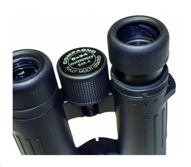 Kompaktný ďalekohľad COMPAGNO 10x34, zväčšenie 10x, predná šošovka 34mm, zorné pole 106m, ostré od 4m, optický výstup 3,3mm, vzdialenosť stredov očí 56-74mm s odstupom 16,0mm, svetelnosť 10,9, stmievateľnosť 18,4, rozmery 130x126x45 mm, hmotnosť 450g, čierny. Kompaktné ďalekohľady DCF so strešnými hranolmi BaK4 - ROOF (DACH). Modelová rada s moderným dizajnom, malými rozmermi, nízkou hmotnosťou a vysokou optickou kvalitou pre kontrastný pohľad aj za zhoršených svetelných podmienok. Výkonný a odolný ďalekohľad s Fully Multicoated úpravou, hranoly z BaK4 skla, vodotesný do 0,5m/15min s ochranou proti zahmievaniu plnením dusíkom, vhodný aj na sledovanie s okuliarmi, nastavenie +/-4 dioptrií, výsuvné krytky okuláru, statívový závit, pogumované telo z ABS. Vrátane textilného puzdra, popruhu a čistiacej utierky. Malý, no maximálne výkonný ďalekohľad do vrecka na turistiku.