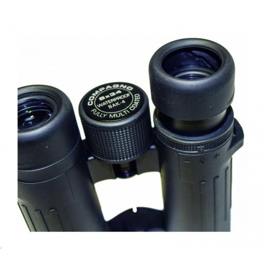 Kompaktný ďalekohľad COMPAGNO 8x34, zväčšenie 8x, predná šošovka 34mm, zorné pole 124m, ostré od 4m, optický výstup 4,2mm, vzdialenosť stredu očí 56-74mm s odstupom 17,4mm, svetelnosť 17,6, stmievivosť 10,9, rozmery 130x126x45 mm, hmotnosť 450g, čierny. Kompaktné ďalekohľady DCF so strešovými hranolmi BaK4 - ROOF (DACH). Modelová rada s moderným dizajnom, malými rozmermi, nízkou hmotnosťou a vysokou optickou kvalitou pre kontrastný pohľad aj pri zhoršených svetelných podmienkach. Výkonný a odolný ďalekohľad s Fully Multicoated úpravou, hranoly z BaK4 skla, vodoodolný do 0,5m/15min s ochranou proti zahmlievaniu plnením dusíkom, vhodný aj pre sledovanie s okuliarmi, nastavenie +/-4 dioptrií, výsuvné kryty okulára, statívový závit, pogumované telo z ABS. Vrátane textilného puzdra, popruhu a čistiaceho handričky. Malý, ale maximálne výkonný ďalekohľad do vrecka pre turistiku.