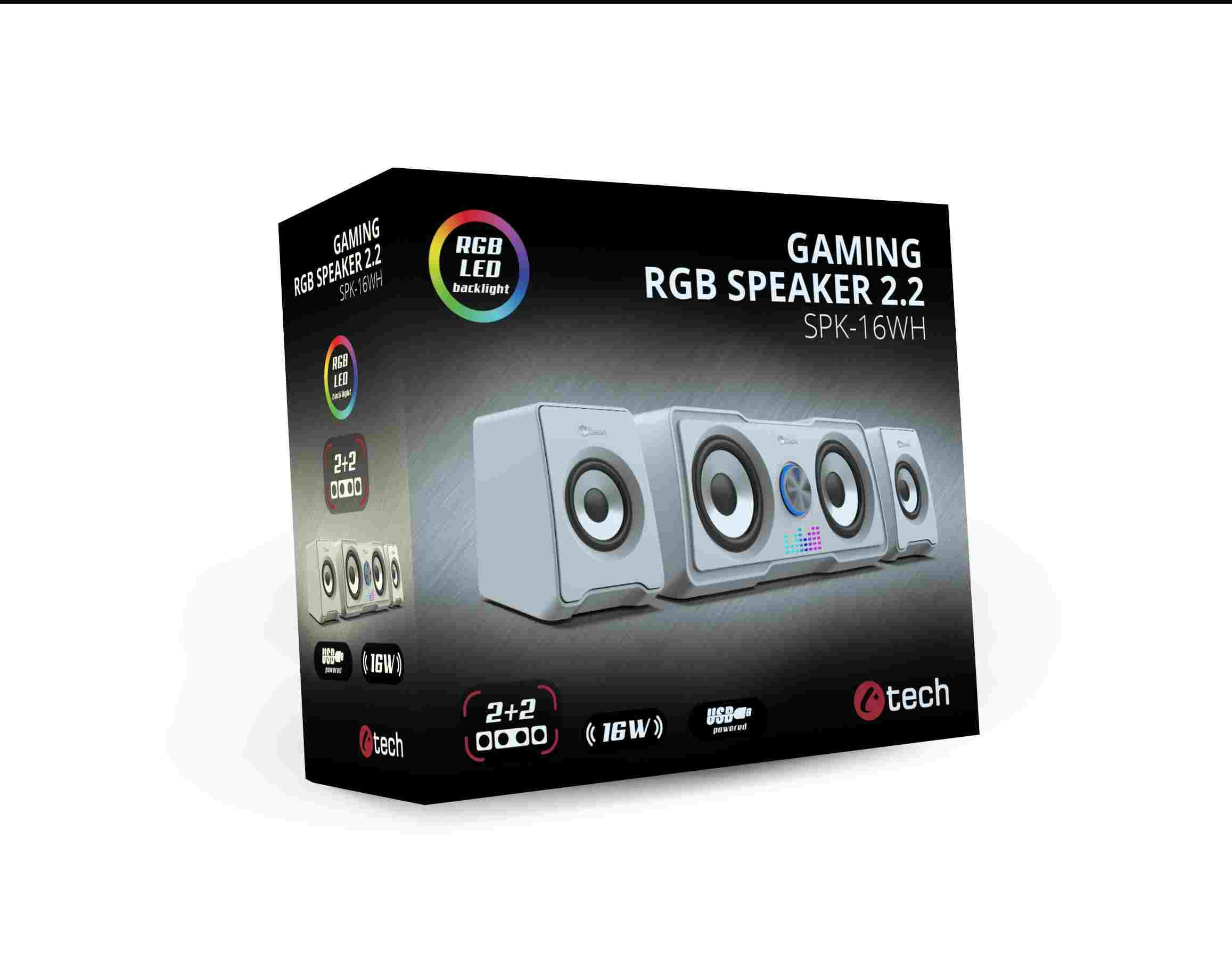 Kompaktné PC reproduktory C-tech SPK-16WH 2.2 vám sprostredkujú kvalitný zvuk s výkonom 16W a frekvenčným rozsahom 150-20kHz. Vďaka unikátnej kombinácii meničov 2+2 je reprodukovaný zvuk bohatší a viac dynamický, takže si ho využijete nielen pri počúvaní obľúbených skladieb, ale aj pri hraní hier. O jedinečnú atmosféru pri počúvaní hudby sa postará automatické RGB podsvietenie. K ovládaniu hlasitosti poslúži regulátor nachádzajúci sa na jednom z reproduktorov. Tento regulátor slúži na zapnutie a vypnutie zariadenia. Pripojenie sústavy k zariadeniam zabezpečí kábel s 3,5mm jackom, napájanie zase USB kábel.