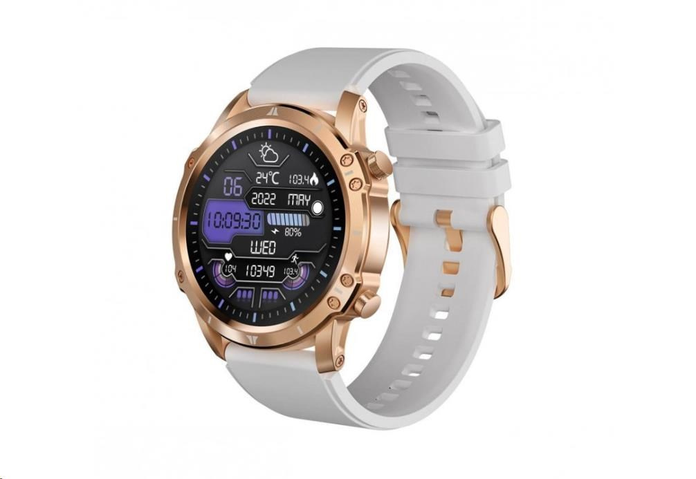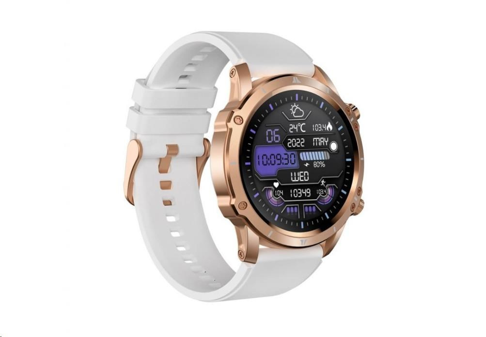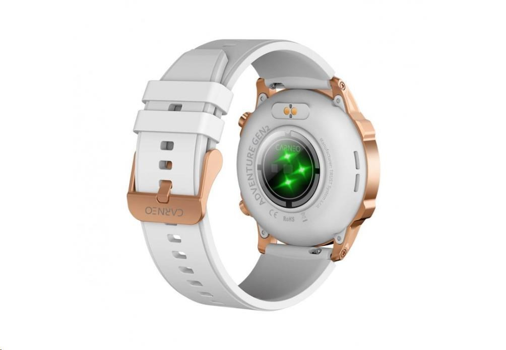 Moderné outdoorové fitness hodinky CARNEO ADVENTURE HR+ druhej generácie v zlatoružovej farbe s bielym, na dotyk veľmi príjemným silikonovým remienkom a farebným SUPER AMOLED displejom s vysokým jasom a funkciou trvalého zobrazenia času monitorujú vašu dennú aktivitu, úroveň stresu, ale je možné ich spárovať s mobilným telefónom a upozorniť vás na prichádzajúci hovor alebo SMS. Hodinky umožňujú telefonovať, aniž by ste museli vybrať telefón z tašky, vďaka vstavanému mikrofónu a reproduktoru až do vzdialenosti 10 m od telefónu. Ich bezchybné kovové telo s nadčasovými outdoorovými krivkami je tak návykové, že ich po prvom nosení nebudete chcieť sundávať zo zápästia. Extrémne odolné sklo Gorilla glass ochráni ich krištáľovo čistý displej pred poškriabaním.
