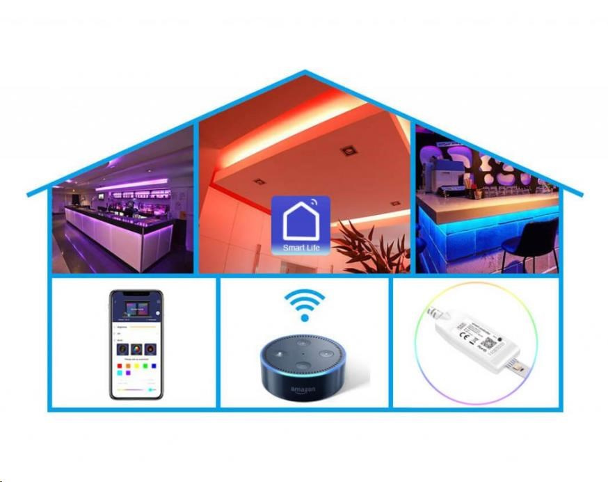 LED pás Carneo Smartlight RGBW Wifi je 5m dlhý flexibilný samolepiaci pás, osadený celkovo 240ks LED diód s plnofarebným svetelným spektrom RGB a teplým bielym svetlom. Farbu a intenzitu svetla si môžete regulovať buď pomocou mobilnej aplikácie SmartLife alebo systémov inteligentného ovládania domácnosti Amazon Alexa alebo Google Home. Aplikácia je kompatibilná s zariadeniami Android vo verzii 4.0 a vyššej a tiež s zariadeniami iOS vo verzii 8.1 a vyššej. Led pásik sa ovláda pomocou technológie WIFI, preto je potrebné ho pripojiť do vašej domácej Wifi siete.