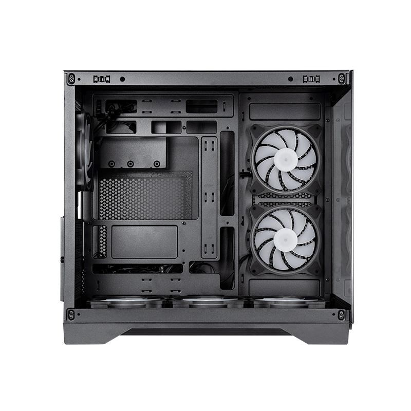 CHIEFTEC Visio má panely z tvrdeného skla na ľavej aj prednej strane a dvojkomorové usporiadanie pre najnovšie základné dosky so zadným pripojením (kompatibilné s ASUS BTF a MSI Project Zero). Táto konštrukcia zjednodušuje správu káblov a zaisťuje jasný výhľad do interiéru a nerušené prúdenie vzduchu.