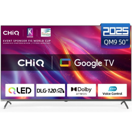 CHiQ U50QM9G, 50" (127 cm), QLED bezrámečková Smart Google TV 5.0, Ultra HD (4K), DLG 120 Hz, MEMC, Dolby Atmos, Dolby Audio, dbx-tv, HDR 10, HLG, WiFi 2,4/5G, Bluetooth 5.0, webový prohlížeč, Google Assistant, Chromecast, O2 TV, YouTube, Netflix, Prime Video, paměť 2GB+16GB, 4x HDMI, 2x USB, CI slot, 20 W, energetická třída G.