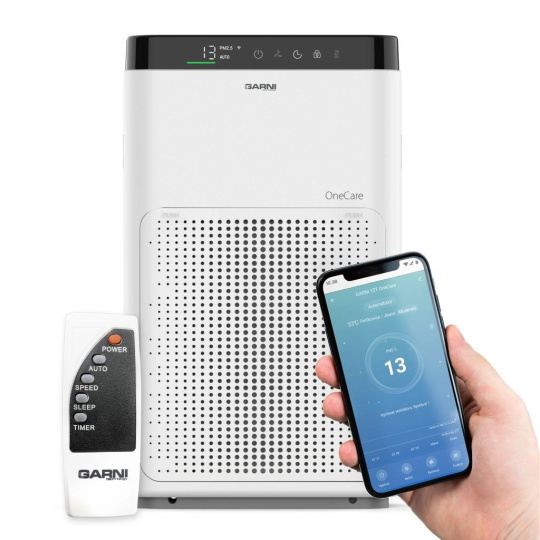Chytrá čistička vzduchu, model GARNI 15T OneCare, zabezpečí vo vašej domácnosti alebo kancelárii pomocou šesťstupňového filtračného systému a zabudovaného senzora na meranie pevných častíc PM2.5 čistejší a zdravší vzduch. Vďaka ľahko čitateľnému invertnému LCD displeju s vysokým kontrastom, tichému chodu, automatickému a nočnému režimu, možnosti sledovať namerané hodnoty online a možnosti spúšťania pomocou ďalších zariadení je model GARNI 15T OneCare zaujímavým prvkom chytrej domácnosti.