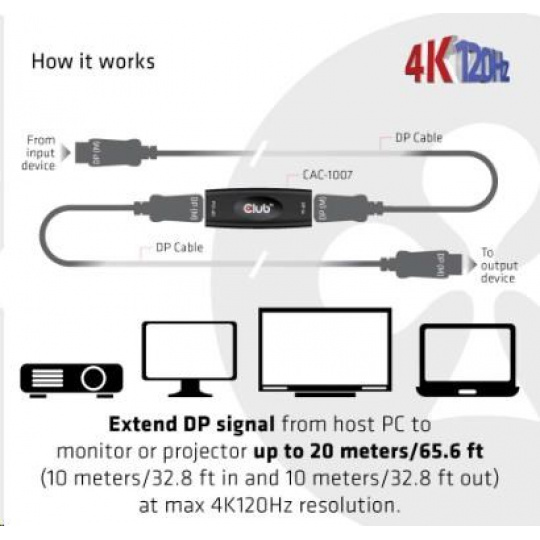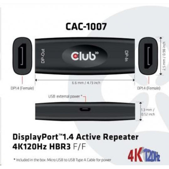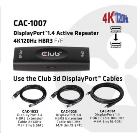 .Club3D Adaptér aktivní DisplayPort 1.4 Repeater 4K120HZ HBR3 (F/F), černá