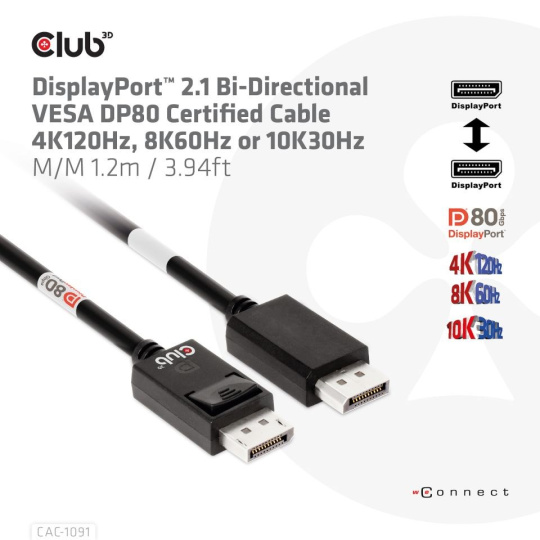 Kábel Club 3D CAC-1091 DisplayPort™ 2.1 umožňuje pripojenie vášho (herná) PC alebo notebooku s podporou DisplayPort™ k (Ultra) monitoru s vysokým rozlíšením alebo inému zariadeniu s podporou DisplayPort™. DisplayPort™ 2.1 UHBR10/13.5/20 až 80 Gb/s, má tiež podporu pre Display Stream Compression 1.2 (DSC), Forward Error Correction a rozširuje maximálny počet vložených audio kanálov na 32. Disponuje zamykateľnými konektormi DisplayPort™ zabezpečujúcimi bezpečné, spoľahlivé spojenie, s NOVÝMI kontaktnými prstami špeciálne navrhnutými pre tieto vysoké rýchlosti. Jednoducho stlačte zabudované jednodotykové tlačidlo na odomknutie konektora. Mäkký plášť UltraFlex chráni kábel pred ohybom a poškodením deformáciami.