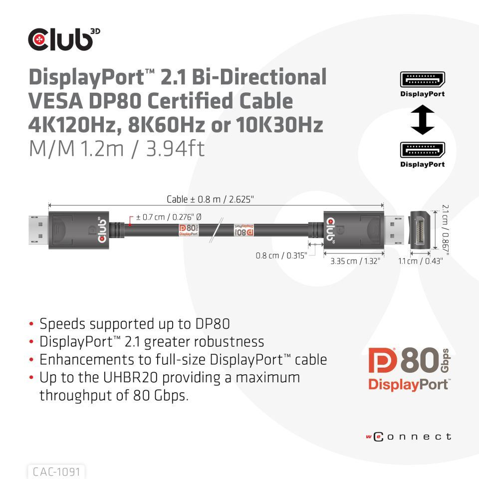 Club3D Kabel DisplayPort 2.1 na DisplayPort 2.1 VESA DP80, 4K240Hz/8K60Hz/10K30Hz HDR (M/M), 1.2m, černá
