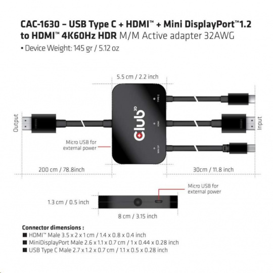 Club3D Active USB Type-C + Mini DP adaptér 1.2+ HDMI na HDMI 4K60Hz HDR, M/M, 32AWG