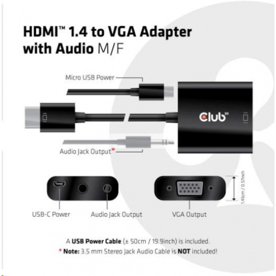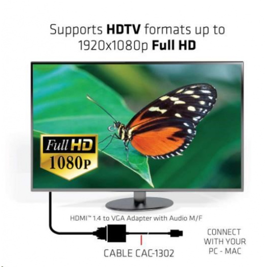 Club 3D CAC-1302 je aktívny HDMI™ 1.4 na prevodník signálu VGA. Umožňuje konvertovať digitálny signál HDMI™ na analógový signál VGA a extrahuje zvukový signál zo signálu HDMI™ prostredníctvom zvukového portu R/L.
