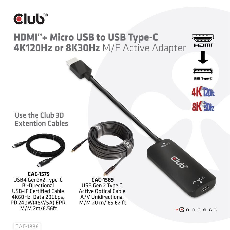 .Club3D Adaptér HDMI + Micro USB na USB-C 4K120Hz/8K30Hz, Active Adapter M/F