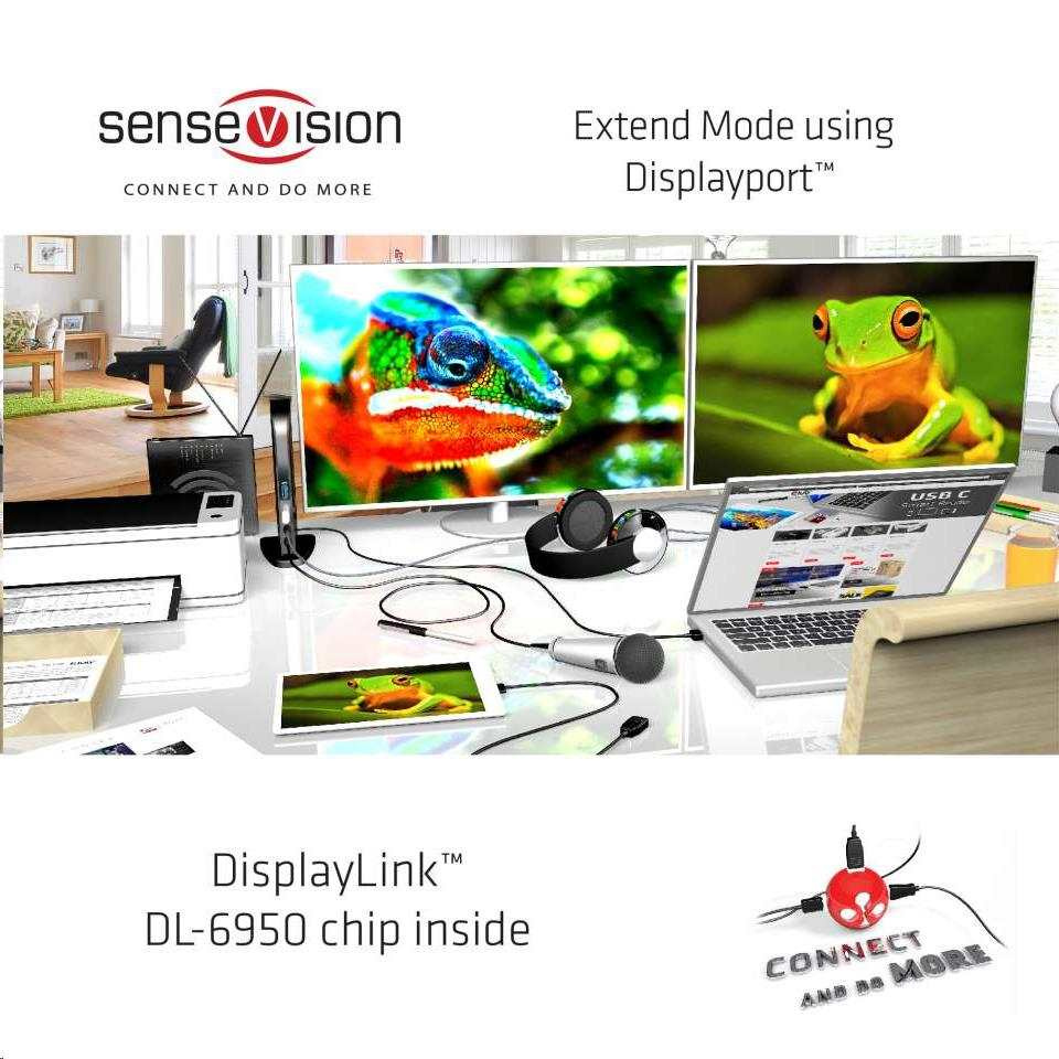 USB 3.0 Dokovacia stanica s dvoma displejmi 4K60Hz Je plne kompatibilný s rozhraním USB C a súčasťou balenia je kábel USB C. S týmto CSV-1460 môžete teraz pripojiť dve obrazovky s rozlíšením 3840x2160 UHD pri 60 Hz k takmer všetkým existujúcim notebookom alebo tabletom len pomocou jedného USB 3.1 port Gen 1! Vďaka pokročilému čipu DisplayLink™ DL-6950 môžete dokonca pripojiť jednu obrazovku s rozlíšením 5K pri 60 Hz! SenseVision USB 3.dokovacia stanica 1 Gen 1 s dvoma displejmi má praktický dizajn a odnímateľný stojan, ktorý umožňuje umiestnenie na stôl v horizontálnej alebo vertikálnej polohe. Je to nástroj na zvýšenie produktivity pre každého výkonného používateľa pracujúceho v (polo)profesionálnom prostredí. Duálny režim DisplayPort™ TECHNICKÉ ŠPECIFIKÁCIE .