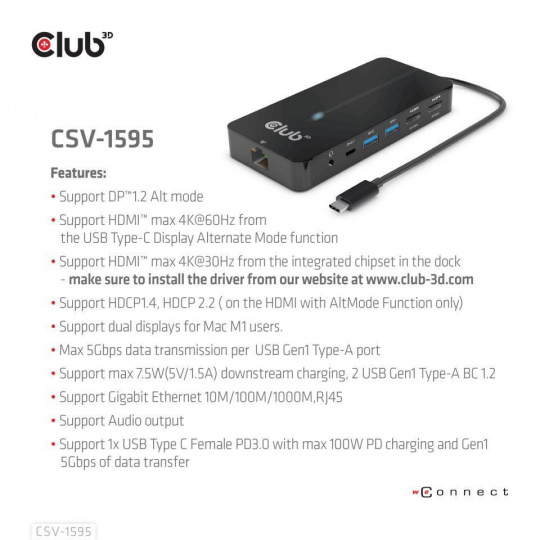 - Support HDMI™ max 4K@30Hz from the integrated chipset in the dock - make sure to install the driver from our website at www.club-3d.com