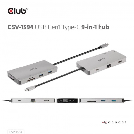 Rozbočovač Club 3D CSV-1594 USB Gen1 Type-C 9 v 1 s HDMI™, VGA, 2x USB Gen1 Type-A, RJ45, slotmi na karty SD/Micro SD a portom USB Gen1 Type-C Female predstavuje veľmi pokročilé a efektívne riešenie na rozšírenie jedného portu USB Gen1 Type-C na viac portov. Integruje video, dátové a napájacie porty, ktoré umožňujú pripojenie 2 displejov súčasne na sledovanie videí na väčšej obrazovke, pripojenie viacerých zariadení USB Gen1 na prenos dát rýchlosťou až 5 Gb/s, pripojenie zdroja Gigabit Ethernet na pripojenie počítača k superrýchlej sieti alebo pripojenie náhlavnej súpravy na počúvanie fantastickej hudby. Poskytuje tiež PD nabíjanie pre podporu až do max. 100W PD nabíjanie. Slúži na prevádzku tohto zariadenia a súčasné nabíjanie hostiteľa. Môže fungovať na všetkých DP™1.2 Podporované hostiteľské zariadenia USB Gen1 Type-C v režime Alt.
