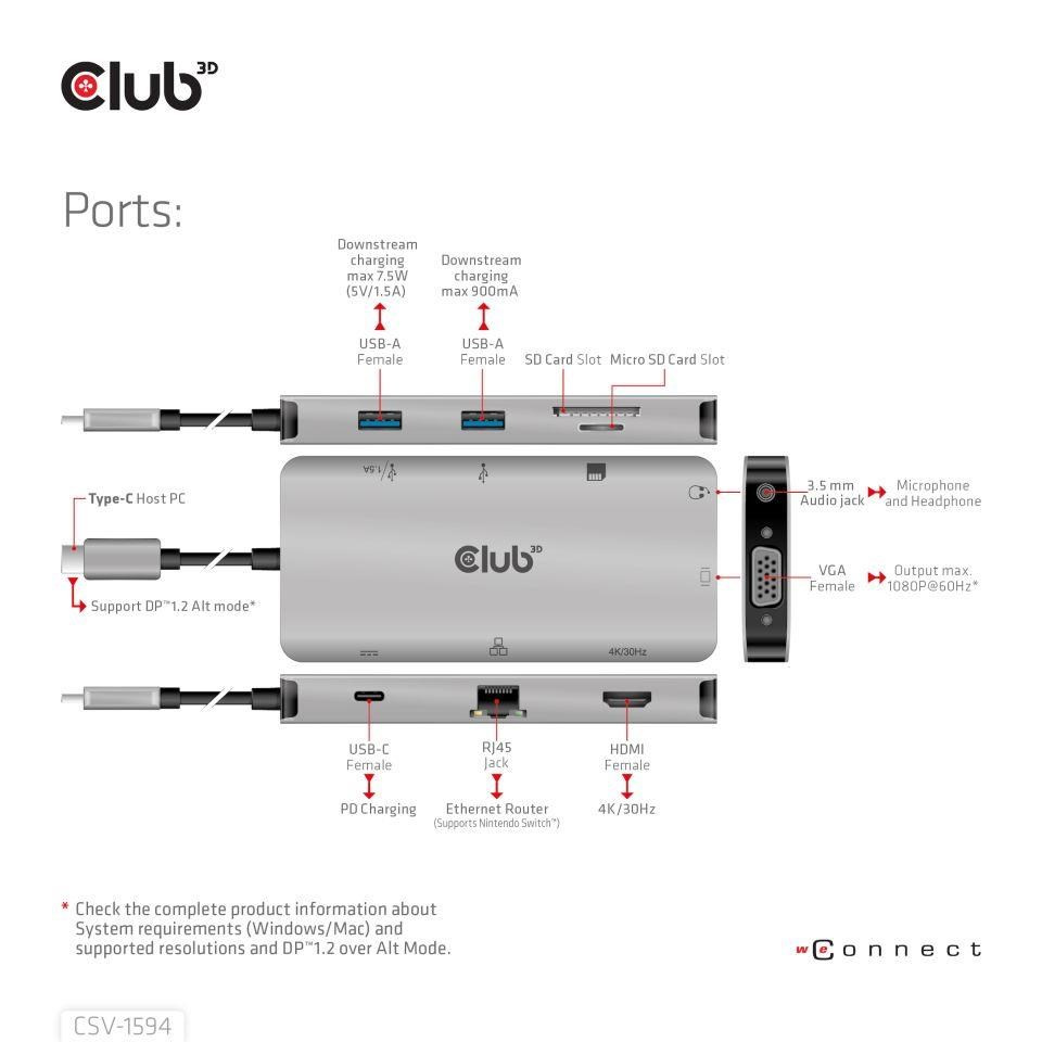Rozbočovač Club 3D CSV-1594 USB Gen1 Type-C 9 v 1 s HDMI™, VGA, 2x USB Gen1 Type-A, RJ45, slotmi na karty SD/Micro SD a portom USB Gen1 Type-C Female predstavuje veľmi pokročilé a efektívne riešenie na rozšírenie jedného portu USB Gen1 Type-C na viac portov. Integruje video, dátové a napájacie porty, ktoré umožňujú pripojenie 2 displejov súčasne na sledovanie videí na väčšej obrazovke, pripojenie viacerých zariadení USB Gen1 na prenos dát rýchlosťou až 5 Gb/s, pripojenie zdroja Gigabit Ethernet na pripojenie počítača k superrýchlej sieti alebo pripojenie náhlavnej súpravy na počúvanie fantastickej hudby. Poskytuje tiež PD nabíjanie pre podporu až do max. 100W PD nabíjanie. Slúži na prevádzku tohto zariadenia a súčasné nabíjanie hostiteľa. Môže fungovať na všetkých DP™1.2 Podporované hostiteľské zariadenia USB Gen1 Type-C v režime Alt.