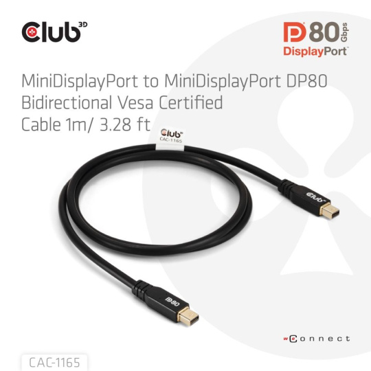 Club 3D CAC-1165 MiniDisplayPort DP80™ koaxiálny kábel Certifikovaný kábel Vesa, 4K240Hz, 8K60Hz alebo 10K60Hz 1m umožňuje pripojenie vášho (hernému) PC alebo notebooku s podporou MiniDisplayPort k monitoru s ultra vysokým rozlíšením alebo inému zariadeniu s podporou MiniDisplayPort.