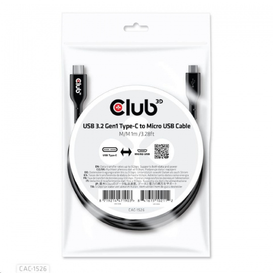 Club 3D CAC-1526 USB 3.kábel 2 Gen1 Type-C na Micro USB umožňuje pripojenie existujúcich výstupných pripojení USB Type-C, notebookov, tabletov a ultrabookov, napájacích nabíjačiek atď. na vstupy Micro USB, ako sú fotoaparáty, telefóny a náš sortiment predlžovacích káblov a adaptérov.