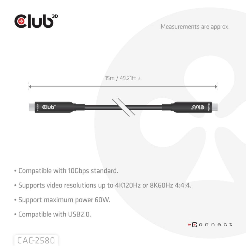 .Club3D Kabel USB-C, 10 Gbps, 4K120Hz, 8K60Hz, 60W, Bi-directional, 15m, černá