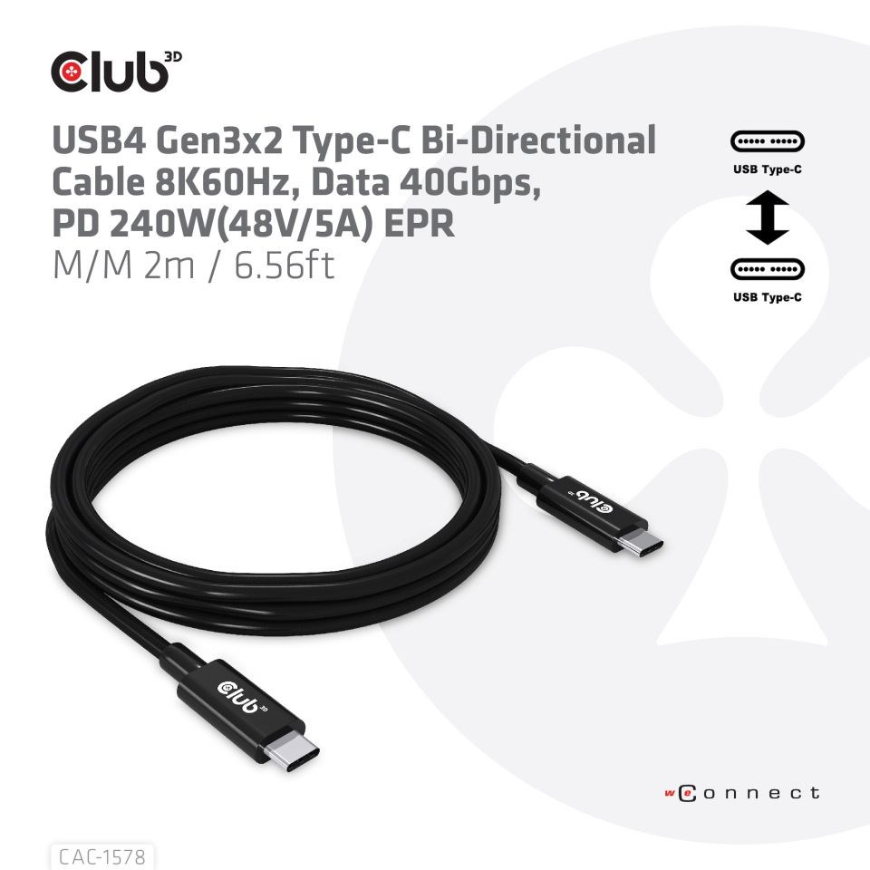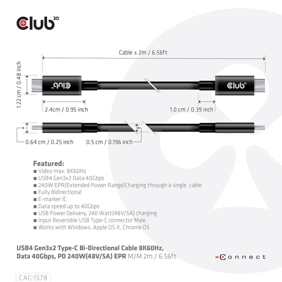 .Club3D Kabel USB4 Gen3x2 Type-C Oboustranný kabel 8K60Hz, Data 40 Gbps, PD 240W(48V/5A) EPR M/M 2m