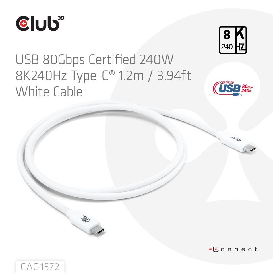 .Club3D Kabel USB4 Typ-C, 80Gbps, Certifikovaný kabel, 4K540Hz, 8K240Hz, 16K60Hz, PD 240W, 1.2m, bílá