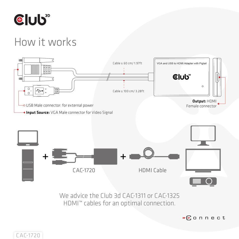 Adaptér Club 3D CAC-1720 VGA a USB Type-A na HDMI™ s pigtailom M/F 0.6m/1.97ft 28AWG spája akýkoľvek stolný počítač, notebook alebo adaptér vybavený VGA s monitorom, displejom, žiaričom alebo projektorom s portom HDMI™ Male. Adaptér je ideálny na použitie doma alebo v práci, vytvára spoľahlivé pripojenie na čokoľvek od hrania hier až po premietanie videa a podporuje rozlíšenie Full HD 1080p (max. rozlíšenie 1920 x 1080). Pre externé napájanie je k dispozícii aj port USB typu A. Tento kvalitný kábel VGA na HDMI™ poskytuje vynikajúci výkon vďaka kombinácii pozlátených konektorov a 28 AWG vodičov. Vnútorné tienenie znižuje presluchy, potláča šum a pomáha predchádzať elektromagnetickému rušeniu (EMI) a rádiofrekvenčnému rušeniu (RFI).